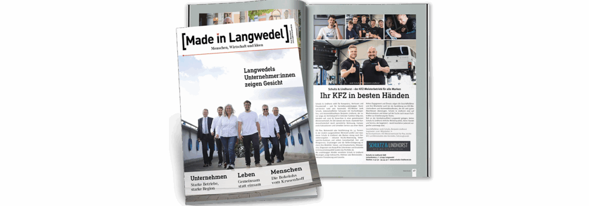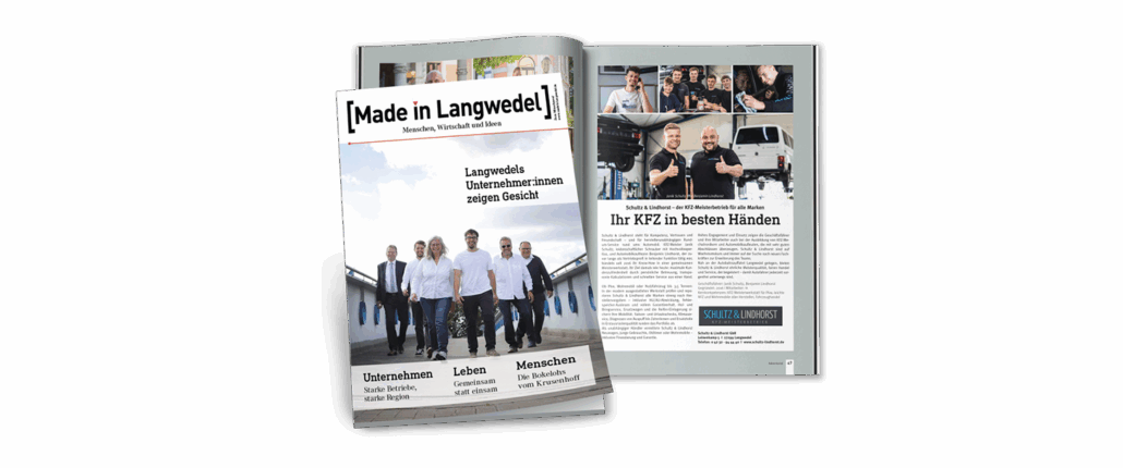 Wir freuen uns sehr: Unser KFZ-Meisterbetrieb Schultz & Lindhorst wurde im aktuellen Wirtschaftsmagazin [Made in Langwedel] porträtiert! Der Artikel zeigt, was uns antreibt – und warum Ihr Fahrzeug bei uns in besten Händen ist.